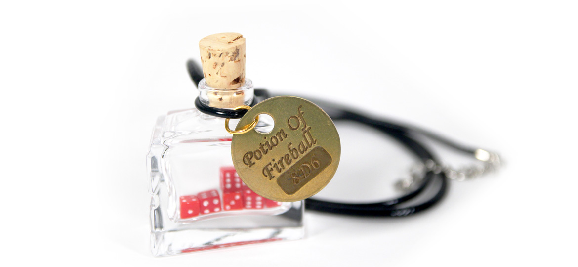 With this hot new fashion statement, you too can carry around a potion of fireball wherever you go. With miniature dice you can actually roll, you just need to dump out the bottle and cast your spell. With secure connectors, this necklace is very secure and won’t break through use, and deep engravings on the metal tag won’t fade over time.