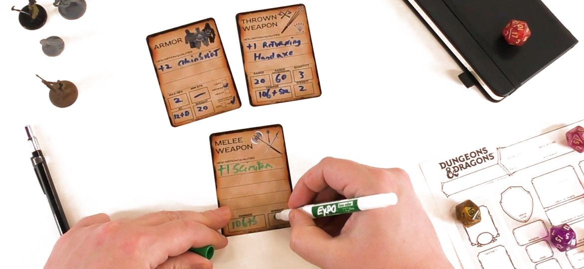 This full-sized and illustrated deck contains cards for each of the most common item types of loot and treasure, including gear and equipment. Each comes with all the stat boxes and information lines appropriate to the item type, making filling them out a breeze, and are fully 5e compatible.