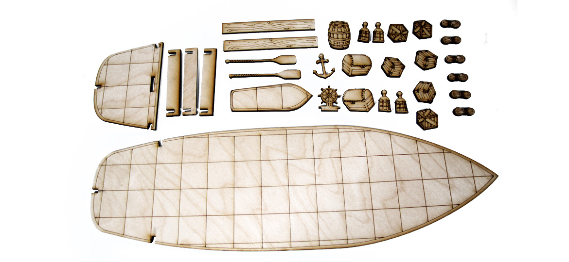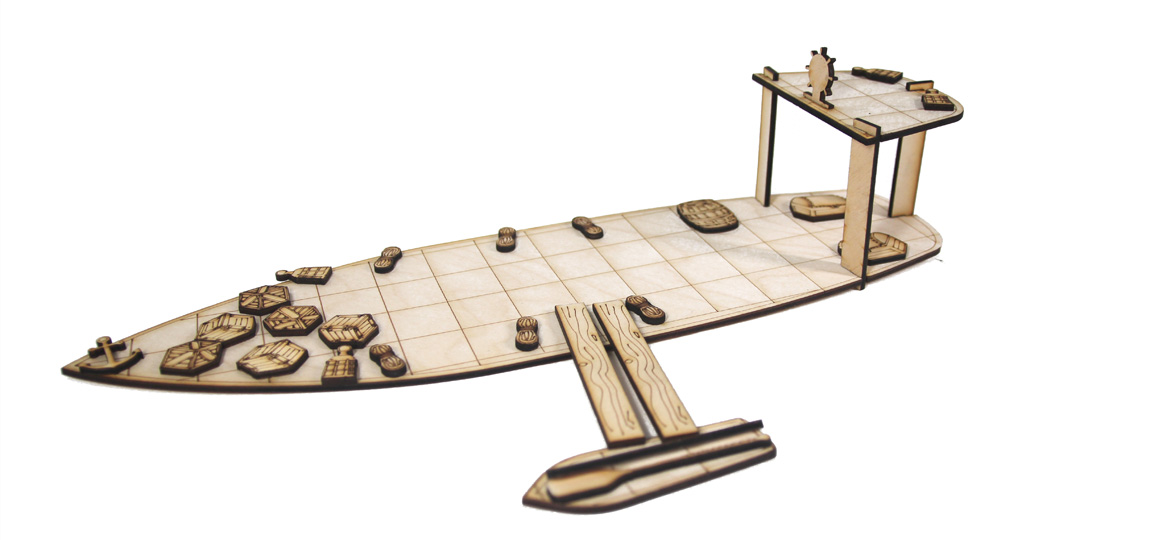 With a two-tiered ship system, lead a sea voyage with a ship fit for an entire party as the crew. With a small life boat and decorations such as a ship wheel, lanterns, and barrels, your only design limit is your creativity. Perfect for any physical representation within your tabletop adventures, and has the ability to be mixed and matched with any of our other wooden ship or dock sets.