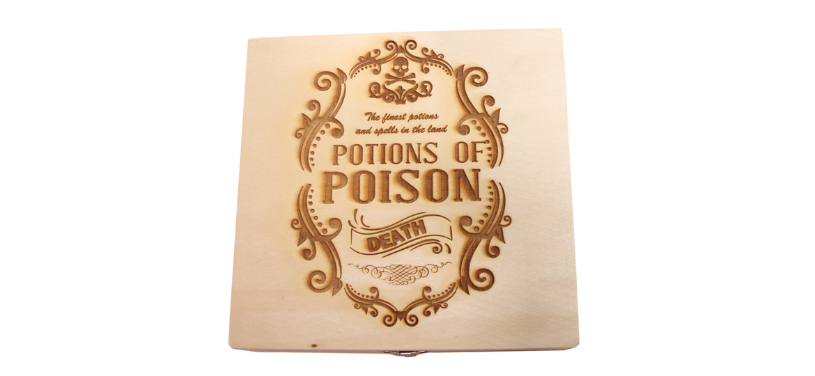 Our Potions of Poison themed boxes are perfect for transporting your Miniatures and dice sets. With many different engravings to choose from, you have the freedom to express your own aesthetic for your table top game supplies. With foam inside to protect miniatures and dice from being jostled around, you can trust the security of our themed boxes.