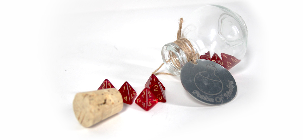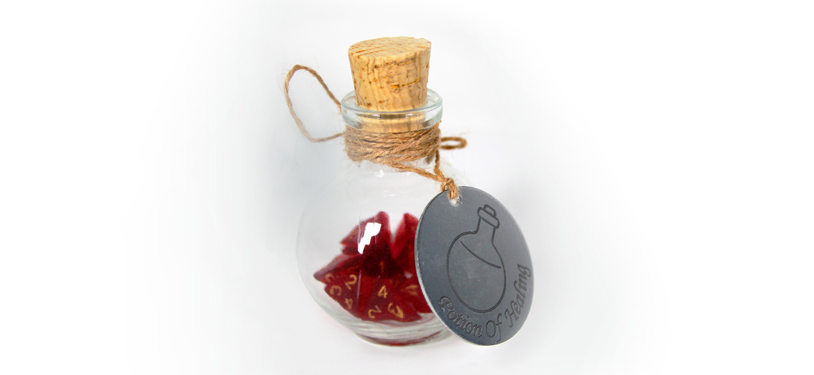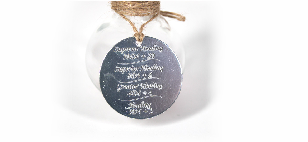 Feel the power of healing within your hands with this round potion bottle of healing. Our round bottle design adds to a more mythological aspect to our potion bottles, and looks like an actual potion due to the shape and cork. The twine also holding the tag on is sturdy and won’t come off, the metal tag has engravings deep enough to not fade, chip, or scratch off over time.